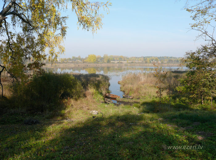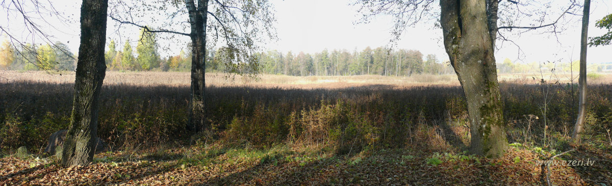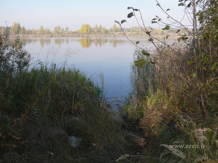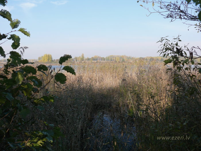 photograph Piekraste sekla, aizaugusi ar platu virsūdens augāja joslu. |