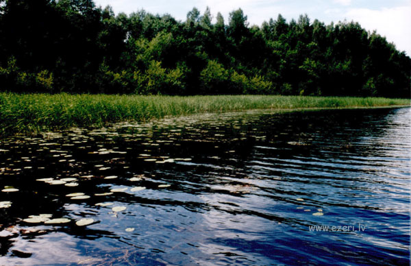 photograph Piekrastē sugām nabadzīga veģetācija - plata niedru un meldru josla, dominē lēpes, ūdensrozes, glīvenes un daudzlapes. |