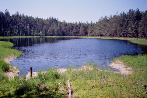 photograph Ezera panorāma. Gar krasta līniju saskalota priežu putekšņu kārta (tās nav smiltis!). 3.06.2000. |