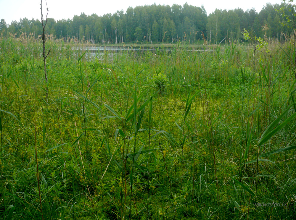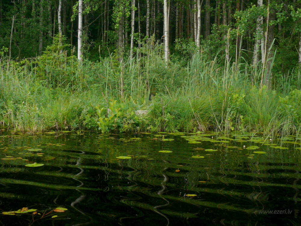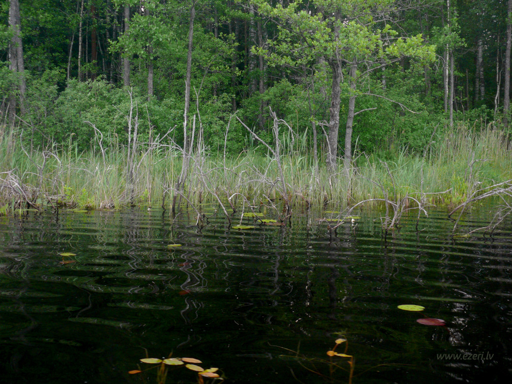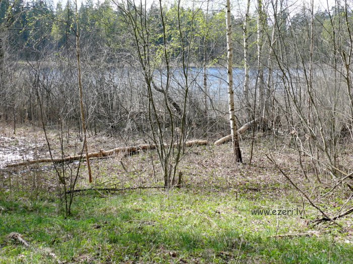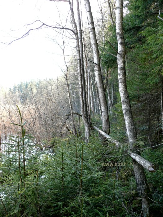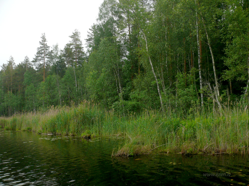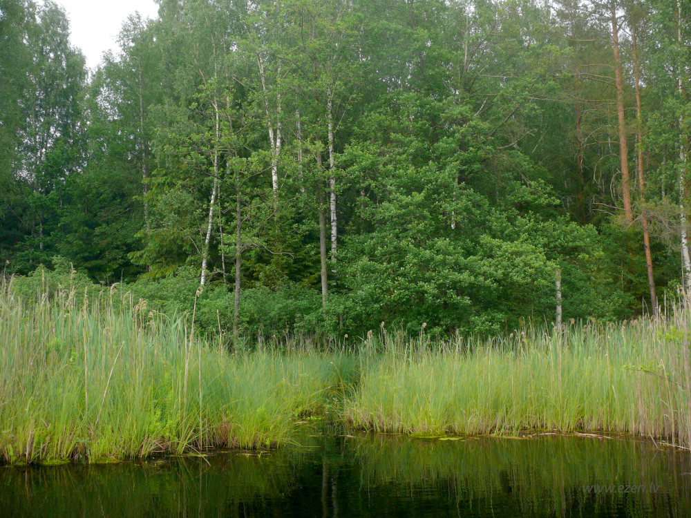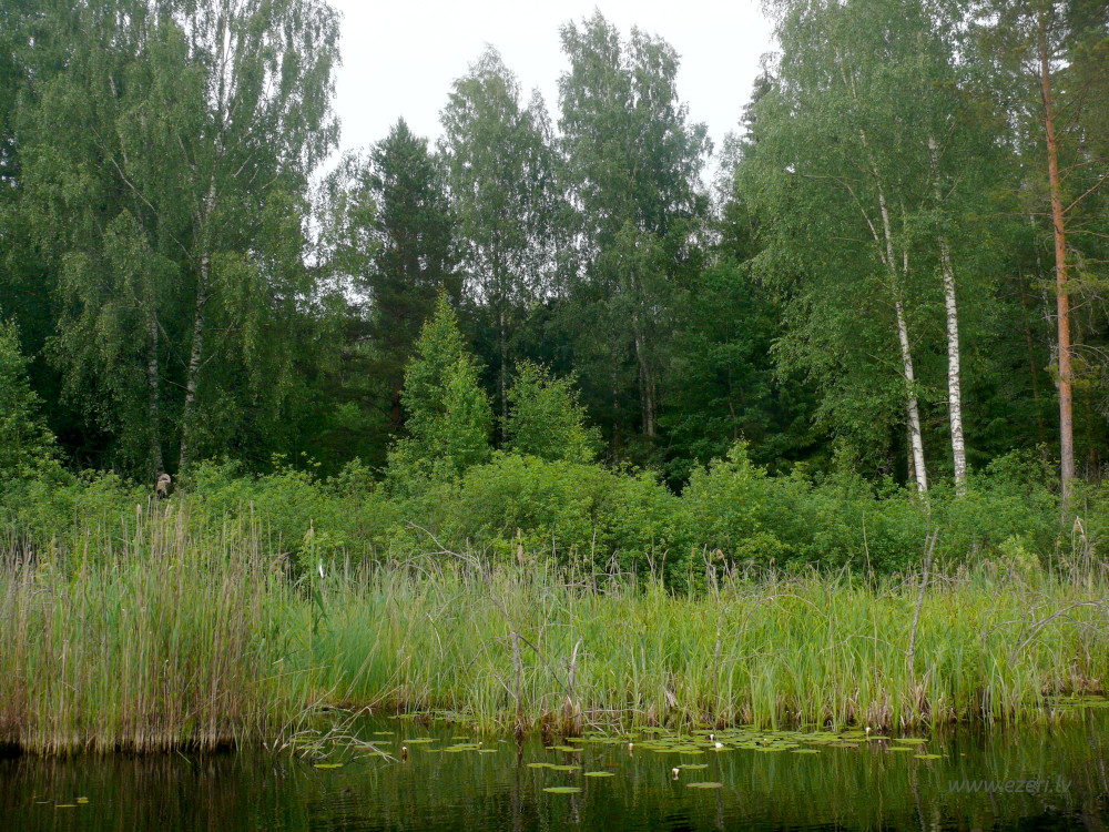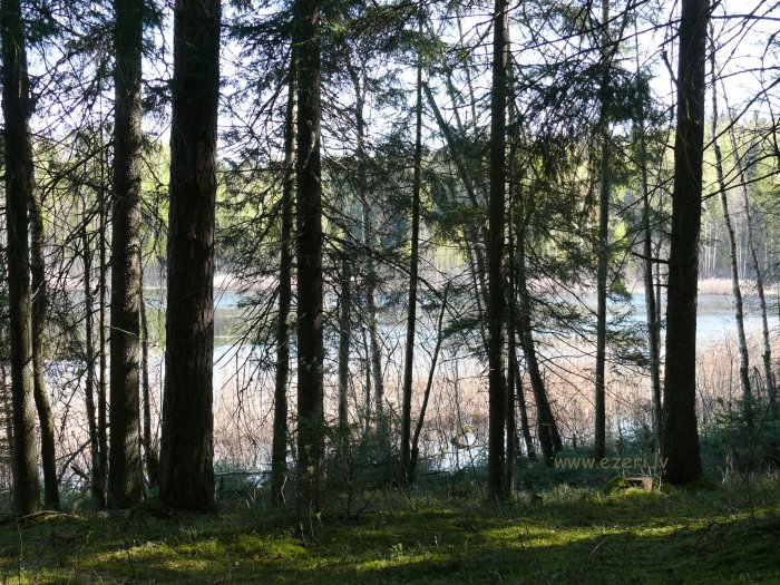photograph Mežs R krastā. Gar ezeru krasts zems, tālāk stāvs. |